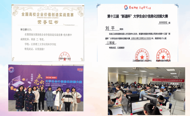 本专业确立了“校企结合、证书导向”的人才培养模式。利用“大数据财务分析、python基础、用友ERP业财一体化、会计分岗位竞赛系统、会计信息化教考系统”等软件,开展校内实践活动,培养员工的动手能力;与九江银行、赣州猎鹰投资管理公司、赣州中浩会计事务所等企业建立校外实践基地,培养员工的就业竞争力;鼓励员工参加会计专业职称考试和各种学科竞赛,培养员工的创新力。