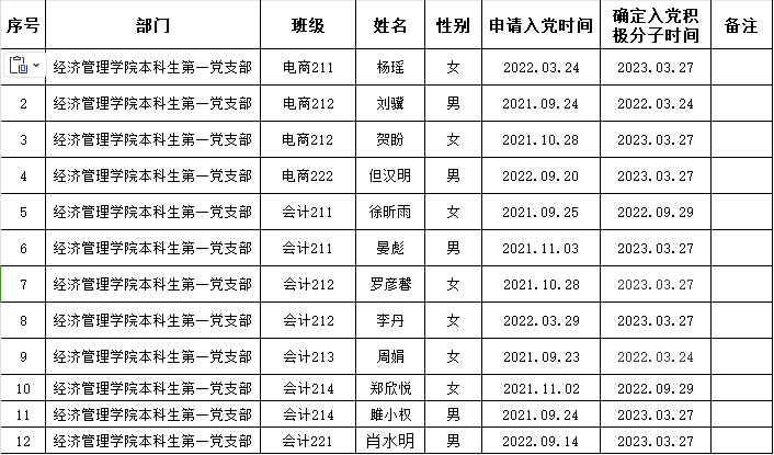 经党组织一年的培养考察,杨瑶等12名同志被列为发展对象。为了进一步增强发展党员工作的透明度,加强对发展党员工作的民主监督,保证新发展党员的质量,现将杨瑶等12名同志的有关情况公示如下: