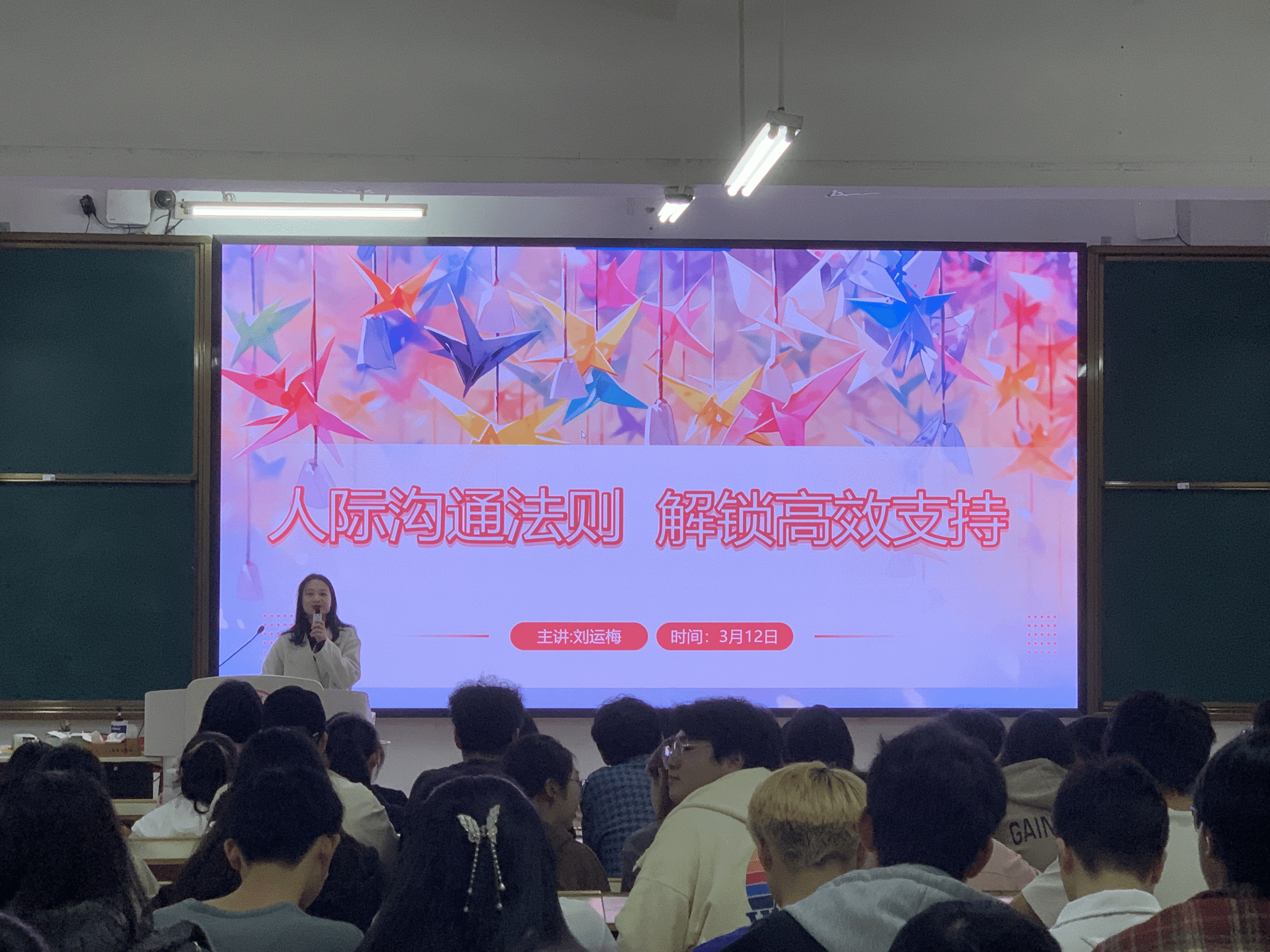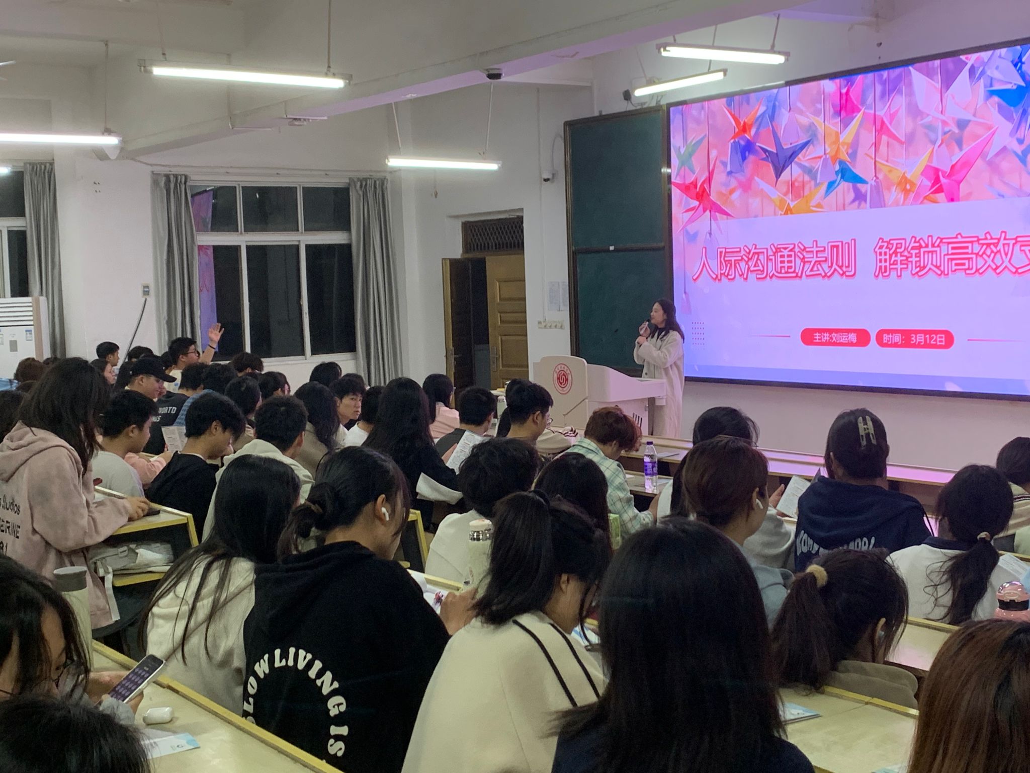 本网讯:3月12日晚上,伟德victor1946网站在主教Z1D1开展以 “人际沟通法则,解锁高校支持” 为主题的心理健康讲座,本次讲座由心理健康教育与咨询中心刘运梅老师主讲。伟德victor1946网站全体辅导员、各班心理委员、心理联络员等200余名员工参加讲座。