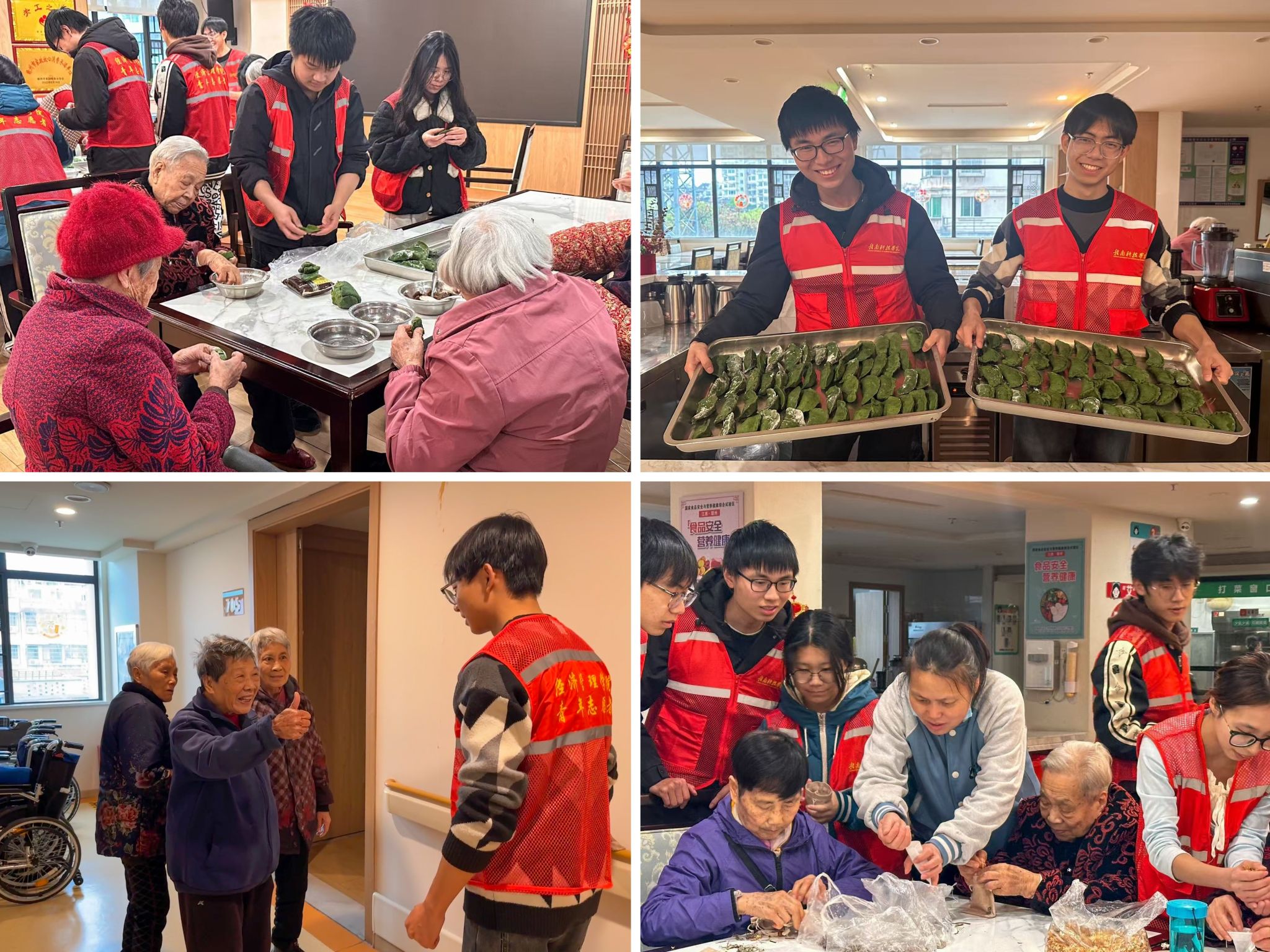 在工作人员的指引下,志愿者们分组协作,助力老人打理居所、清扫庭院内外。劳动过程中,他们悉心擦净门窗尘垢,整理归置各类物品,同时与老人们话家常,细心询问他们的日常所需。在温馨的手工共创环节,志愿者与老人们围坐一堂,共同动手制作传统青团。揉面、裹馅、塑形……老人们手把手教志愿者们传统制作技法。而在另一边,志愿者则拿出了准备好的彩布、艾草等材料,与老人们一同缝制起香包来,针线穿梭间,一份份饱含祝福的香包逐渐成形。活动尾声,在志愿者们精心准备的歌舞节目中,大家围坐在一起,共同品尝着艾米果,现场氛围其乐融融,老人们的脸上洋溢着幸福的笑容。志愿者马莹娜表示,这次经历让她深切感受到了与老人一起制作青团的欢乐时光的珍贵,也愈发坚定了她传承和发扬尊老敬老及传统手工艺的决心。