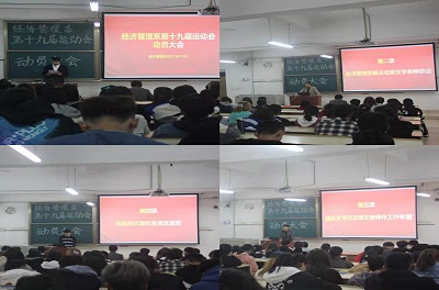 本网讯:10月22日下午,经济管理系在主教Z1D4召开了第十九届运动会动员大会。经济管理系副主任梁文学、团总支书记王博文出席了大会,全体员工干部及参赛运动员参加了会议。