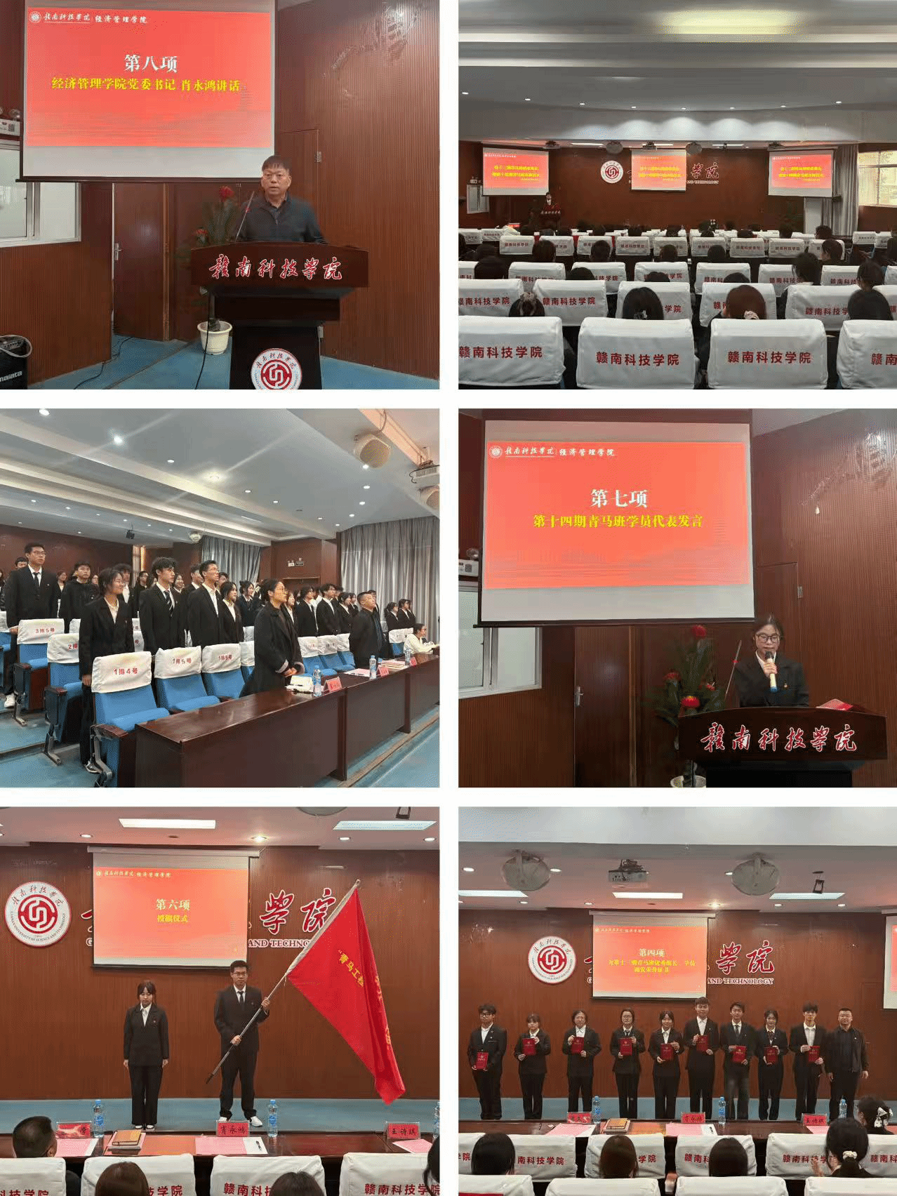 仪式伊始,全体学员昂扬唱响共青团团歌。随后,第十三期青马班优秀学员代表邹秋桔上台发言。她分享在青马班一年的学习与实践经历,从理论研习时的思想碰撞,再到社会实践中的责任担当。随后,到场领导老师先后为第十三期青马班班助颁发聘书、为优秀组长及学员颁发荣誉证书,鼓励他们将青马精神融入日常学习生活,持续发挥模范带头作用;第十四期青马班班助程紫婷宣读第十四期青马班班规,从理论学习、实践活动、纪律要求等方面作出明确规定。授旗仪式上,第十三届青马班班长将青马班班旗授予第十四期青马班班长,班旗在两代“青马人”手中完成传递,也标志着第十四期青马班正式踏上成长征程;第十四期青马班学员代表周佳凤代表全体新学员表态,将珍惜此次学习机会,严守班规纪律,主动投身理论学习与实践锻炼。