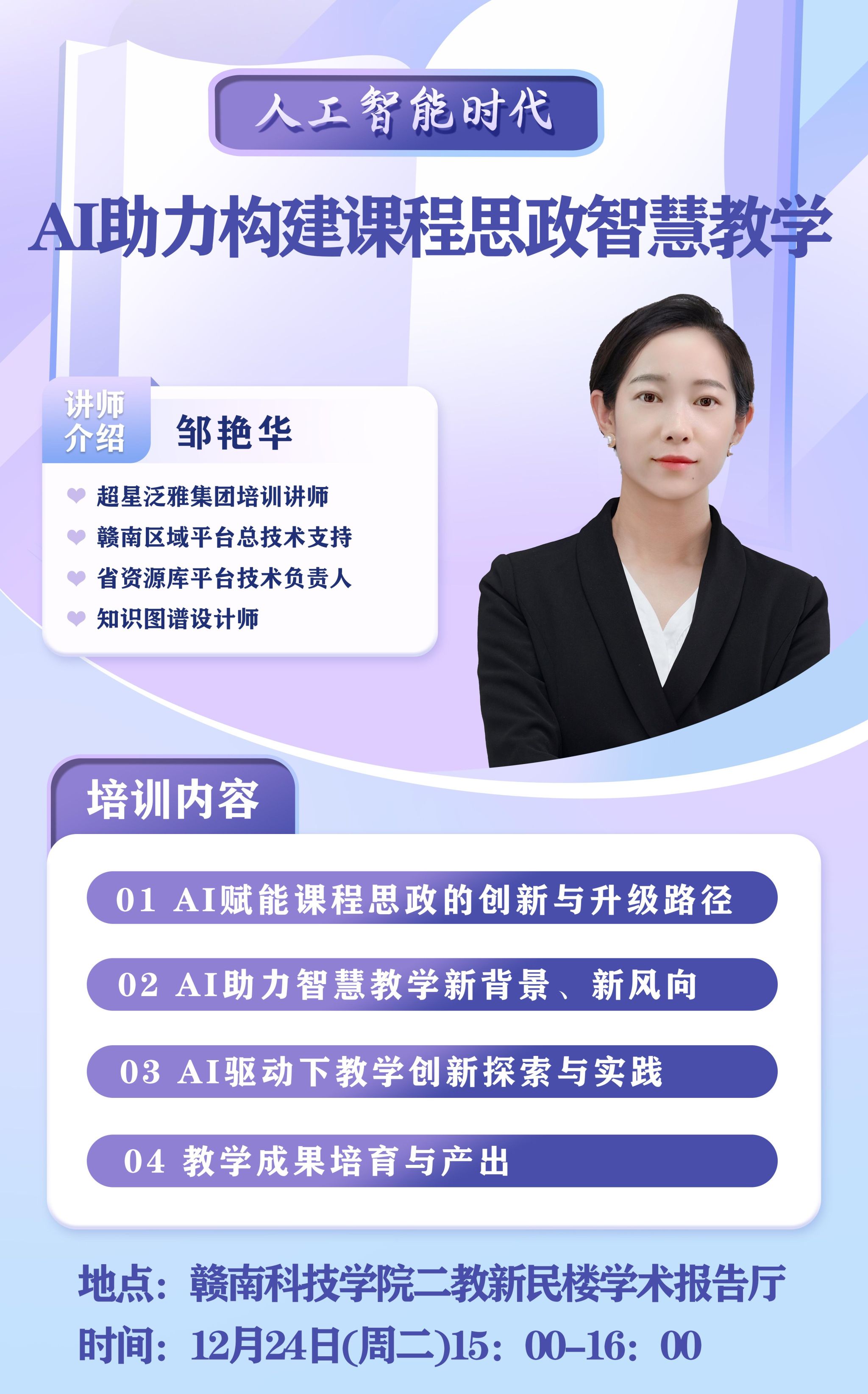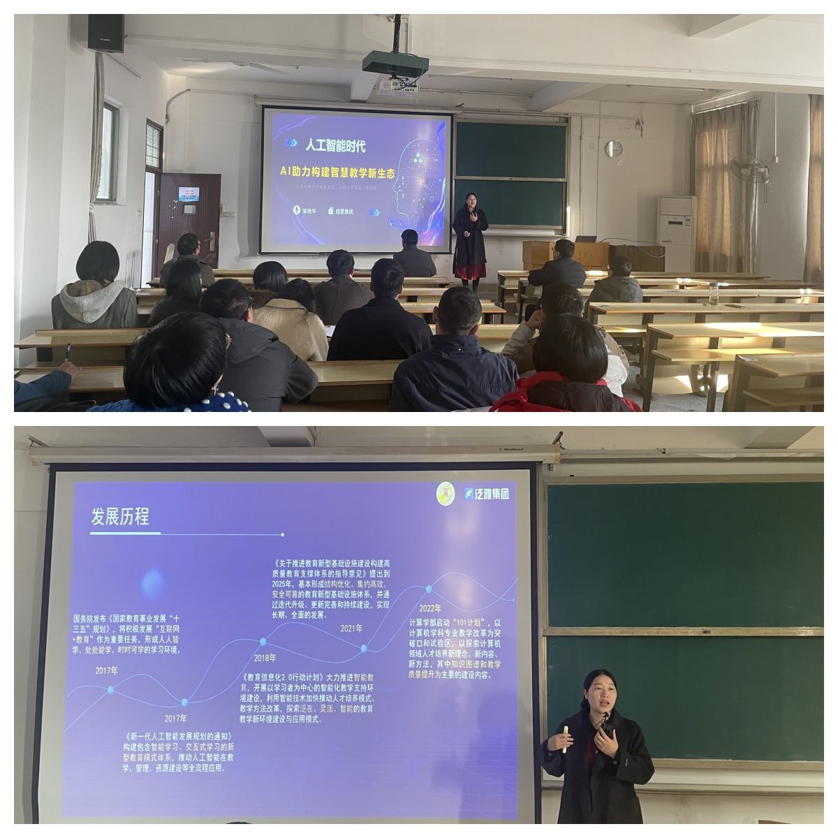 本网讯:在数字化转型浪潮席卷全球的今天,伟德victor1946网站紧跟时代步伐,于12月24日在新民楼302教室举办一场题为“人工智能时代AI助力构建课程思政智慧教学”专题讲座。讲座邀请超星集团邹艳华老师担任主讲嘉宾,公司全体教职工参加讲座。