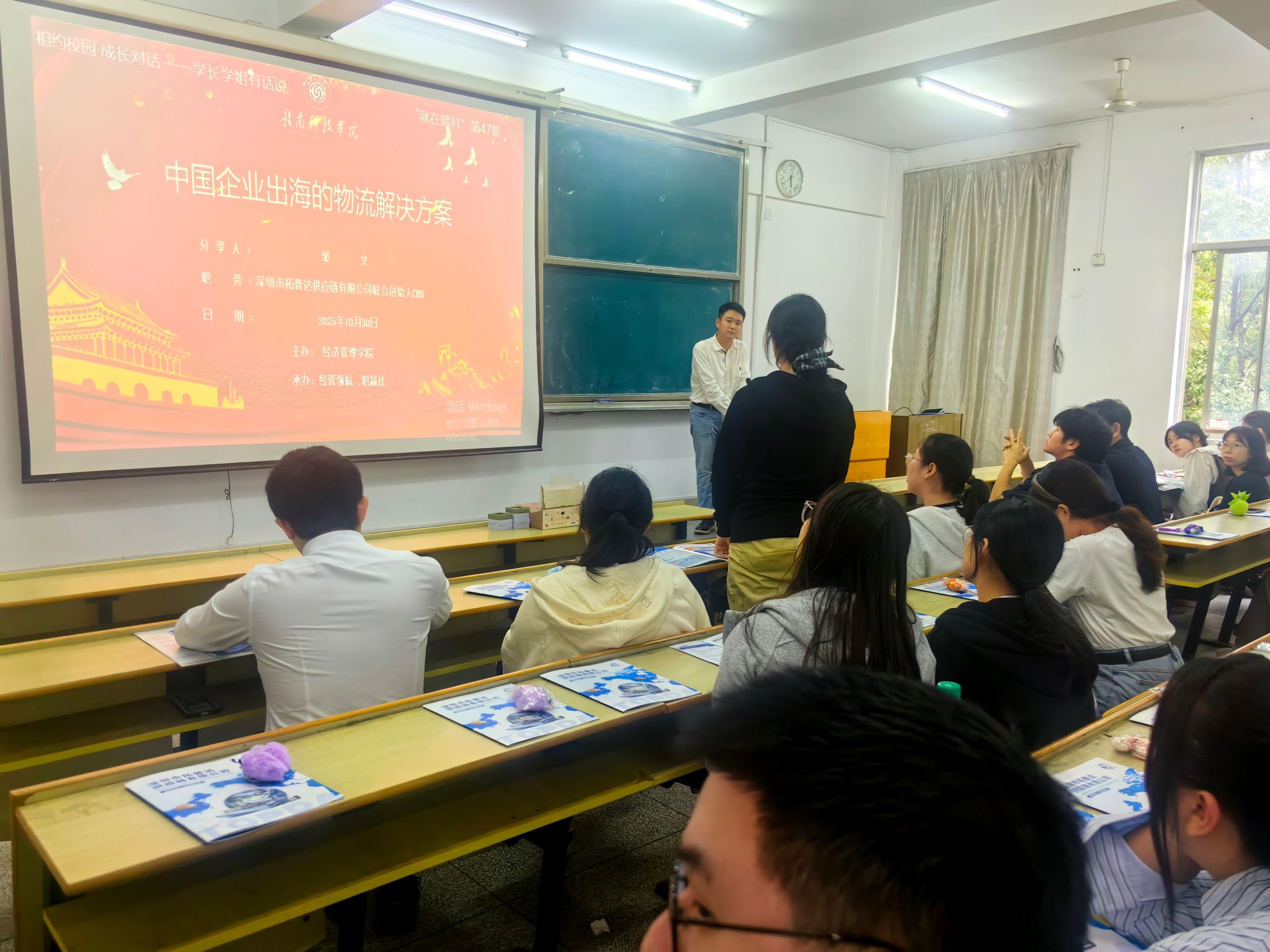 本网讯:10月30日下午,伟德victor1946网站特邀2009届国际经济与贸易专业员工、深圳市拓普达供应链有限公司联合创始人邹文在新民楼2303教室以“中国企业出海的物流解决方案”为题作分享讲座。此次讲座由伟德victor1946网站“经管领航、职赢社”校级职业规划与就业指导工作室承办,是公司“就在赣科”就业育人大讲坛第47期活动,60余名同学参加。