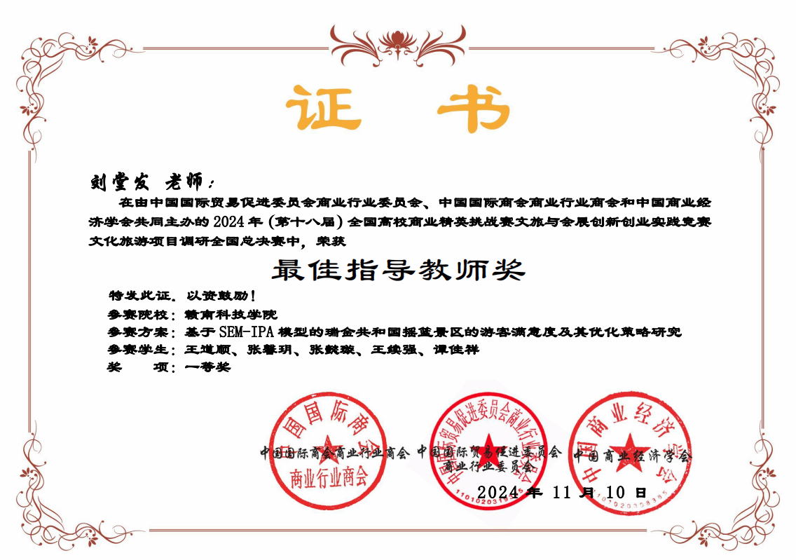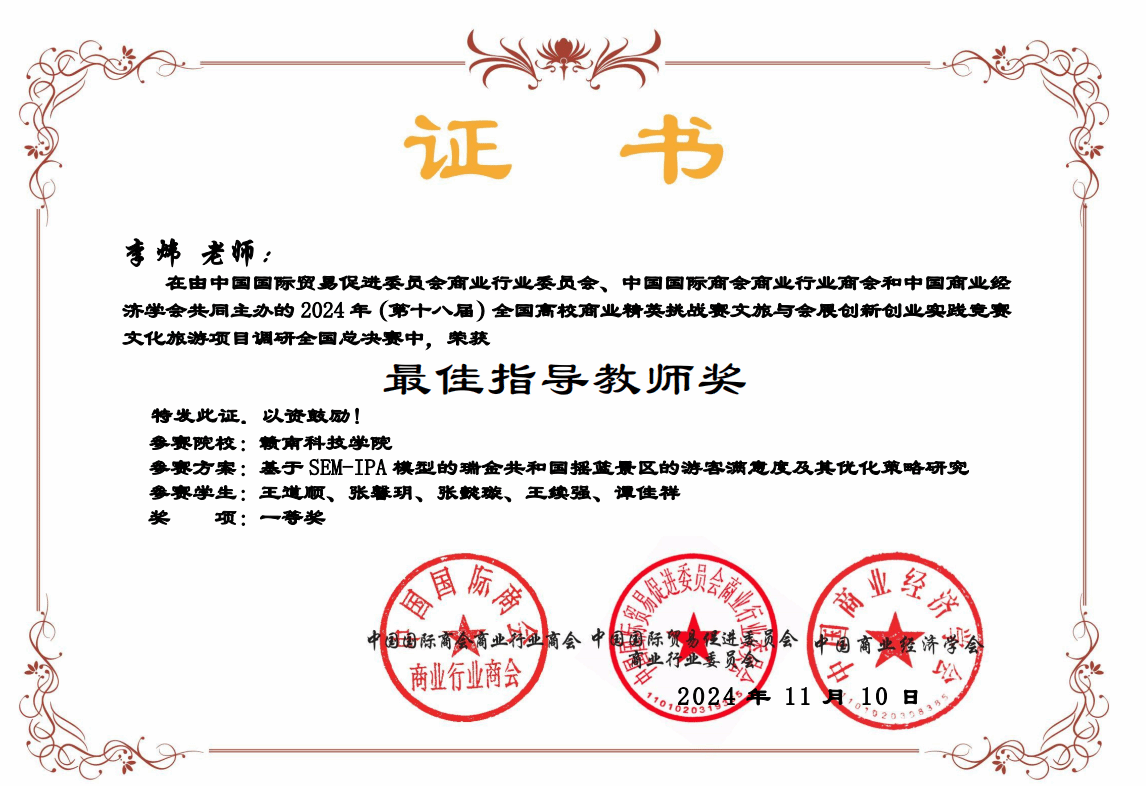 本网讯:10月26日—11月9日,第十八届全国高校商业精英挑战赛文旅与会展创新创业实践竞赛全国总决赛圆满落下帷幕。本次比赛由伟德victor1946网站刘堂发、李炜老师组织,公司参赛团队凭借扎实的专业知识、创新的思维理念和出色的团队协作精神,一路过关斩将,获全国一等奖1项、二等奖1项、三等奖2项,省赛一等奖2项、二等奖2项、三等奖7项的好成绩,最佳院校组织奖,刘堂发、李炜老师获最佳指导教师奖。