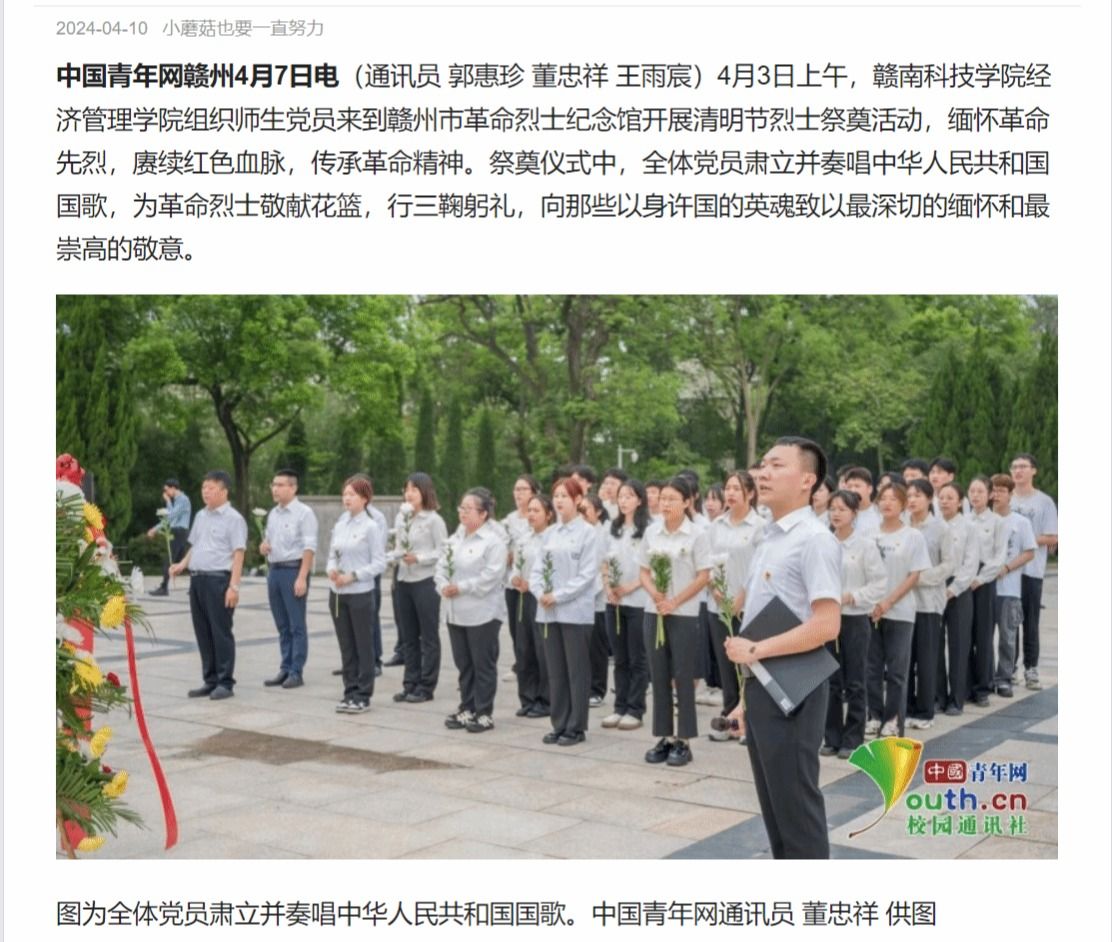 中国青年网赣州4月7日电(通讯员 郭惠珍 董忠祥 王雨宸)4月3日上午,伟德victor1946网站组织师生党员来到赣州市革命烈士纪念馆开展清明节烈士祭奠活动,缅怀革命先烈,赓续红色血脉,传承革命精神。祭奠仪式中,全体党员肃立并奏唱中华人民共和国国歌,为革命烈士敬献花篮,行三鞠躬礼,向那些以身许国的英魂致以最深切的缅怀和最崇高的敬意。