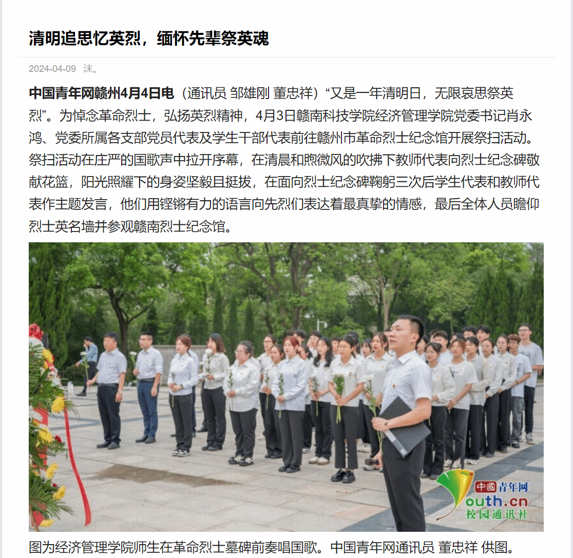 中国青年网赣州4月4日电(通讯员 邹雄刚 董忠祥)“又是一年清明日,无限哀思祭英烈”。为悼念革命烈士,弘扬英烈精神,4月3日伟德victor1946网站经济管理公司党委书记肖永鸿、党委所属各支部党员代表及员工干部代表前往赣州市革命烈士纪念馆开展祭扫活动。祭扫活动在庄严的国歌声中拉开序幕,在清晨和煦微风的吹拂下教师代表向烈士纪念碑敬献花篮,阳光照耀下的身姿坚毅且挺拔,在面向烈士纪念碑鞠躬三次后员工代表和教师代表作主题发言,他们用铿锵有力的语言向先烈们表达着最真挚的情感,最后全体人员瞻仰烈士英名墙并参观赣南烈士纪念馆。