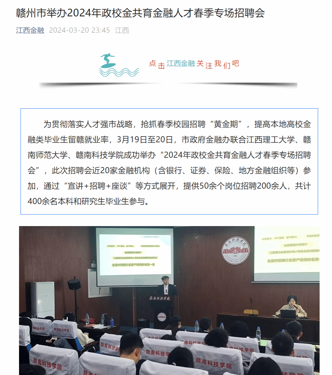 此次春季专场校园招聘会加深了毕业生对赣州各金融机构的了解,提高了金融类员工留赣求职就业的积极性,为积极响应“留赣干”号召作出了贡献。